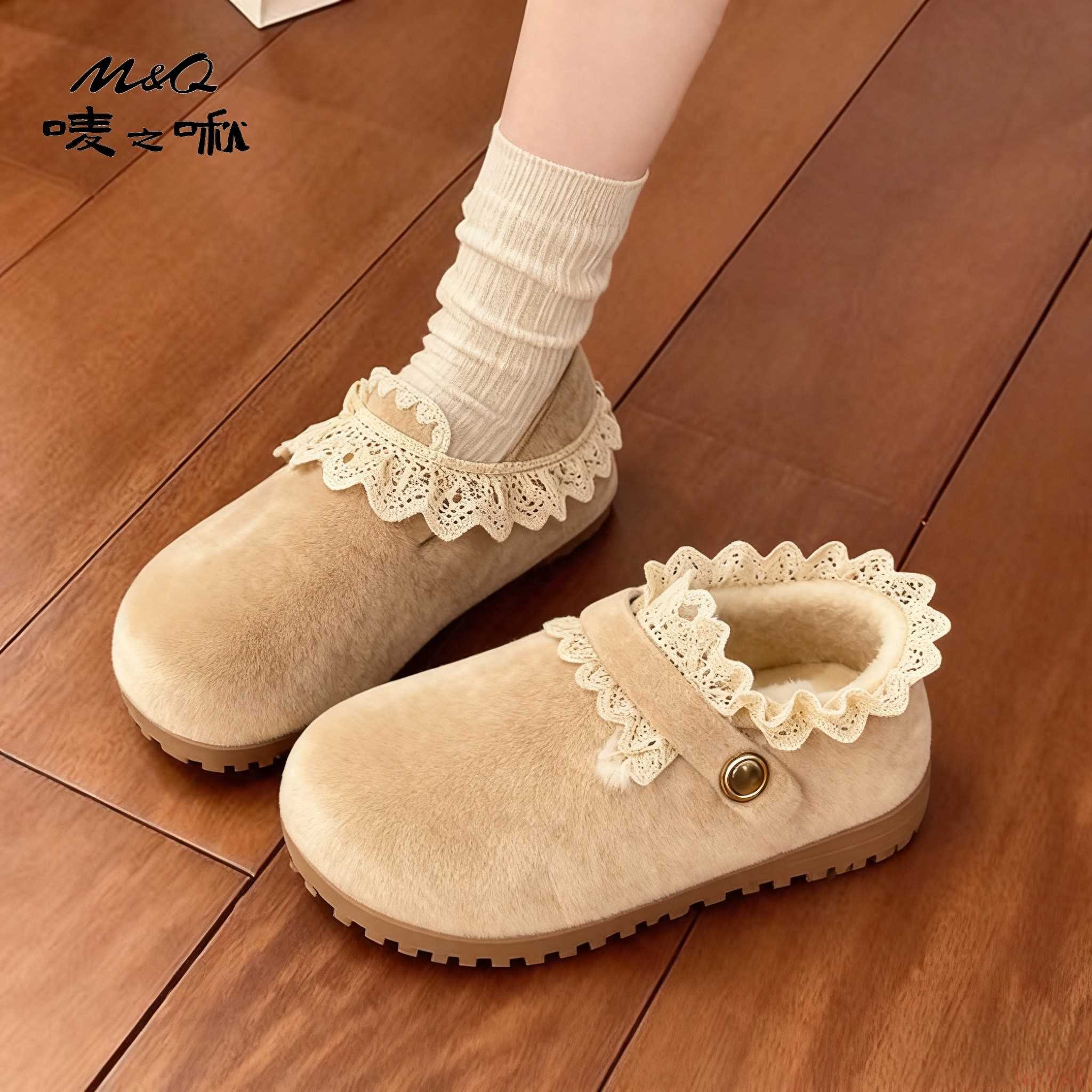 在米白色毛绒花边棉鞋上,细腻的绒毛包裹双脚,蕾丝花边如冬日的初雪轻落在鞋口,金属圆扣轻轻扣合,既锁住温暖,也锁住了复古少女的温柔。