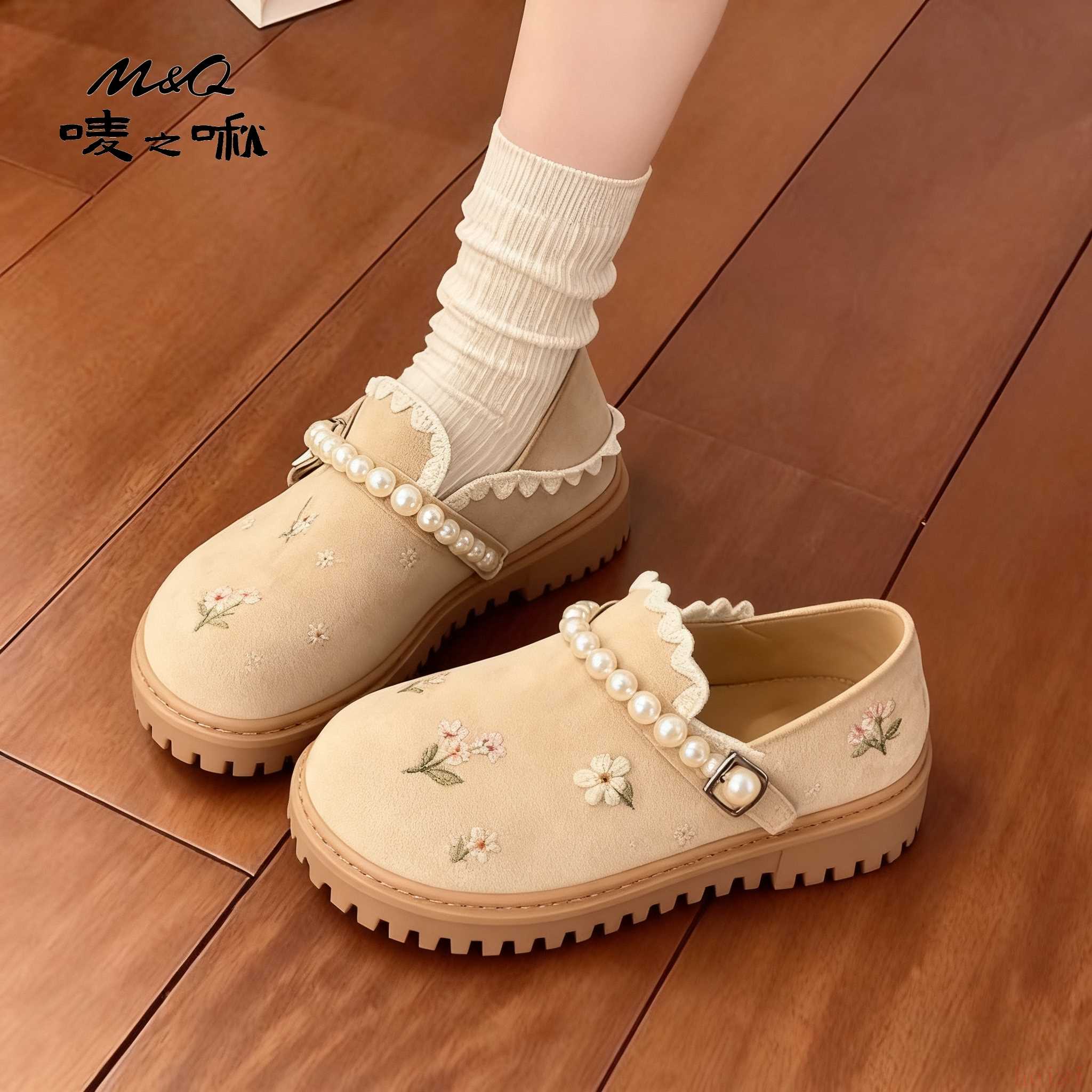 米黄色绒面绣花厚底鞋则将“浪漫”与“增高”巧妙结合,精致的花朵刺绣与珍珠装饰,让每一步都像在花丛中漫步,厚底设计更是为小个子女生带来福音。