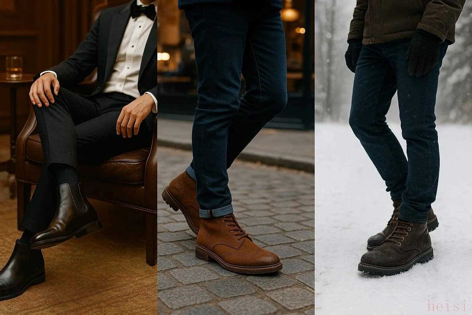 "休闲场合:" 日常通勤、朋友聚会、户外活动等,选择沙漠靴、切尔西靴、工装靴等休闲款式。