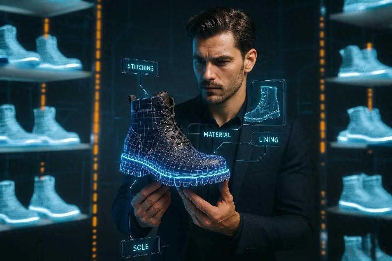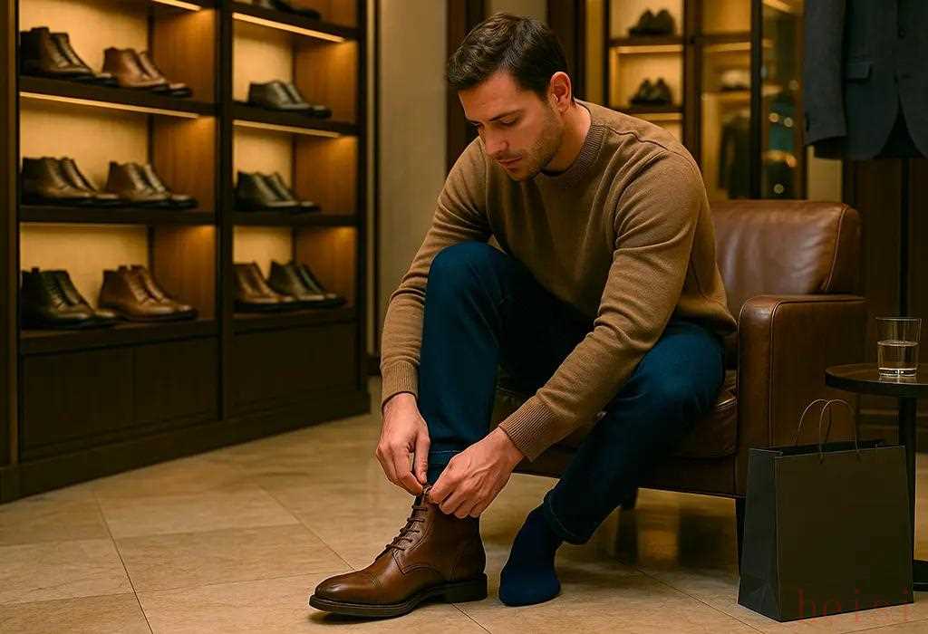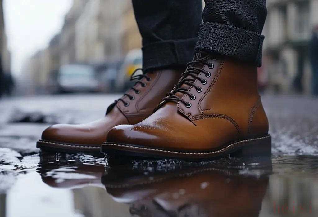 "简约风格:" 选择简洁线条、经典款式的靴子,如黑色牛津鞋、棕色沙漠靴。