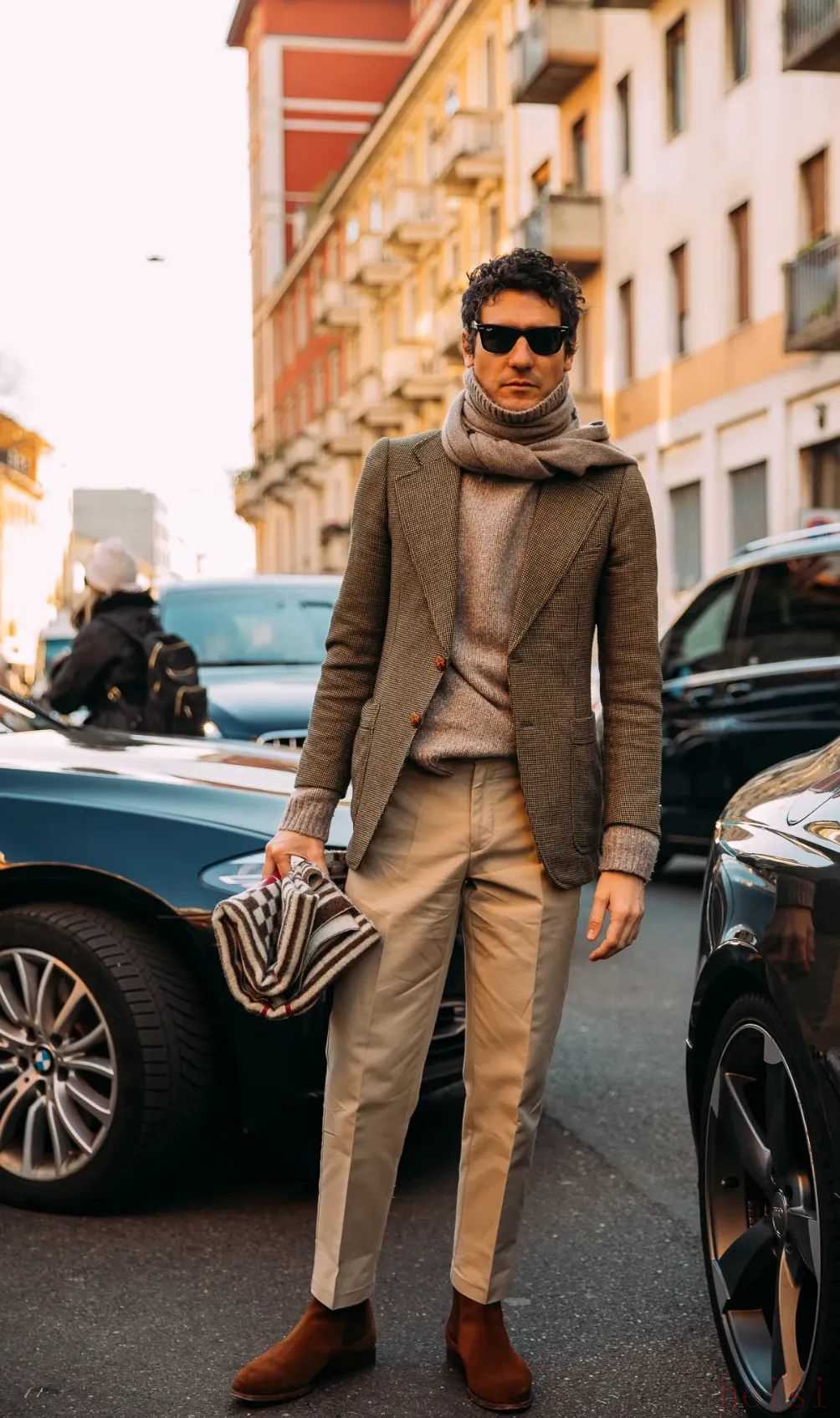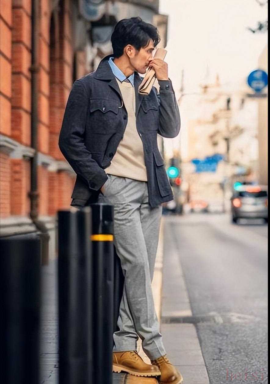 休闲商务的时候,不妨选择修身呢料西装 + 高领毛衣 + 卡其裤 +棕色切尔西靴,既干练又时髦,注意裤子长度刚好到靴筒,整体线条流畅。