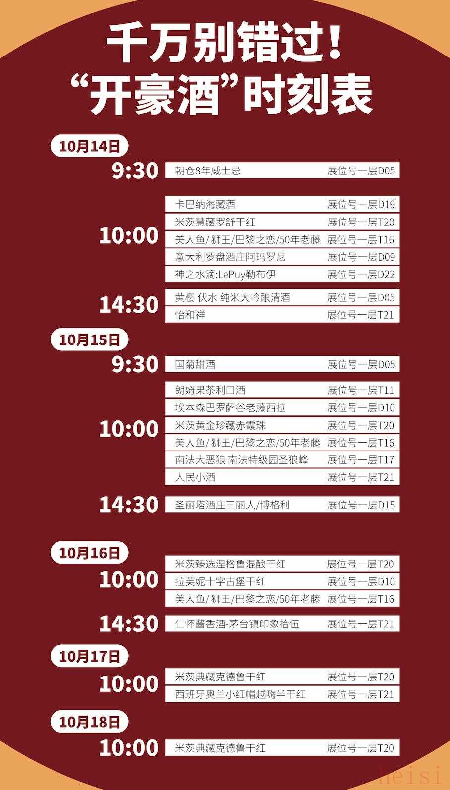 10月14日-18日期间,特别为您整理一份精彩酒款开瓶时刻表。您可以对照时刻表,前往对应位置品鉴美酒,开启惊喜时刻。