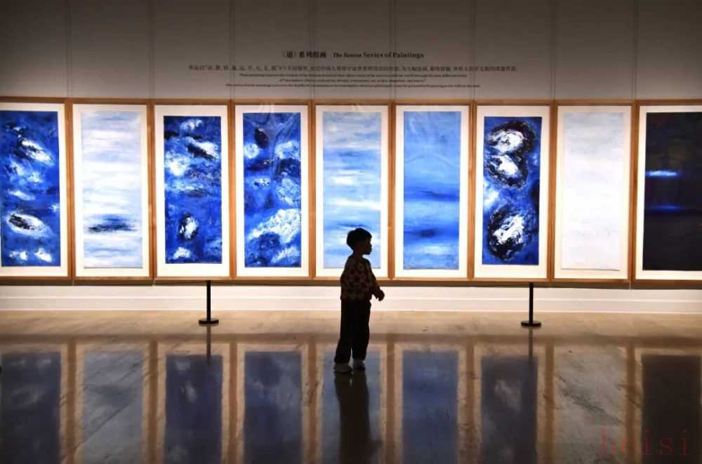 走在展厅,最中央也是最醒目的一幅画,是二十四节气中的冬至,蓝黑为底,隐约透出缕缕暖白。这是一年中白昼最短、阴气至极的一天,中国古人认为,恰恰在这一天,阳气开始萌生。