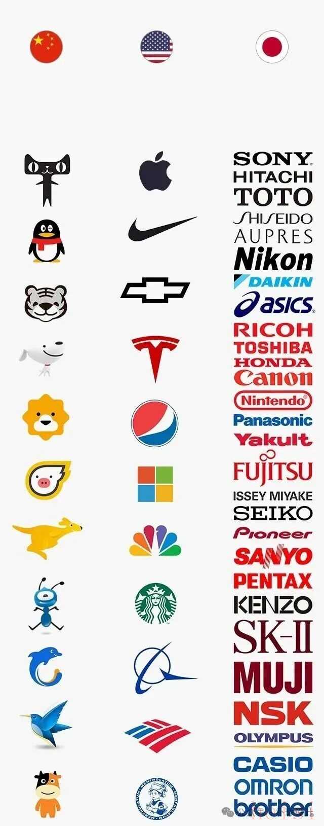 中、日、美三国的知名品牌Logo在设计理念、风格和侧重点上存在一些差异,这些差异往往反映了各自国家的文化、设计趋势和市场特点。以下是一些观察到的不同之处: