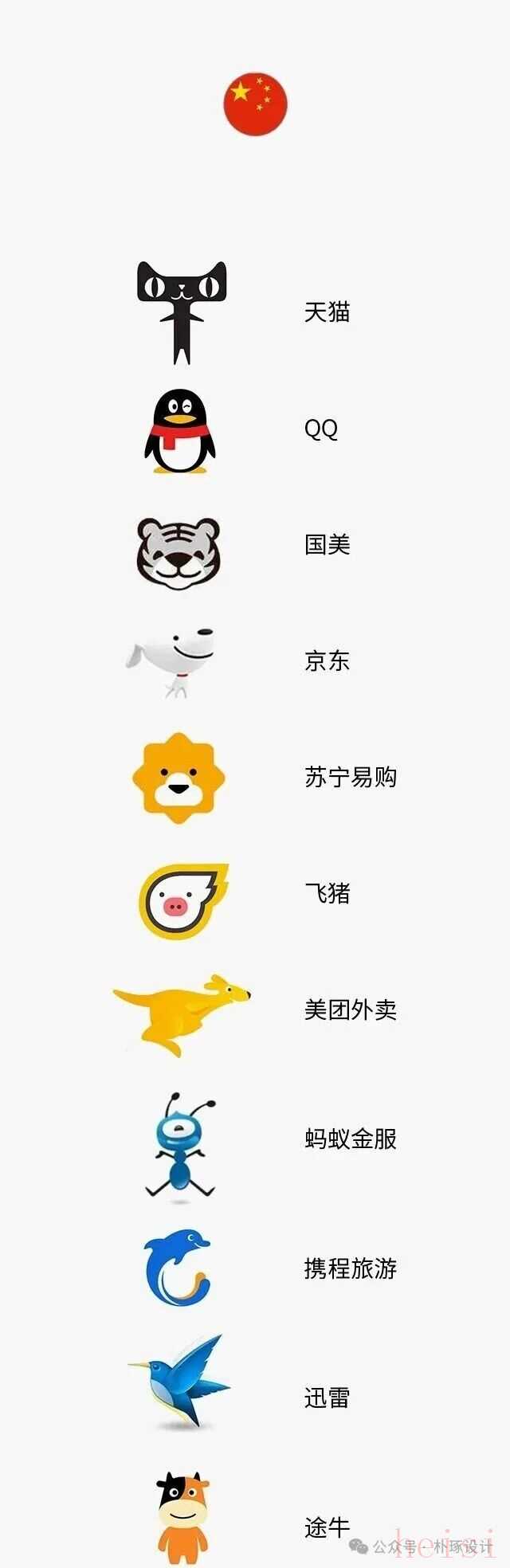 中国众多知名品牌logo提到中国品牌的动物logo,阿里系绝对是“集邮大户”:天猫的猫、闲鱼的鱼、蚂蚁金服的蚂蚁、千牛的牛……有人笑称“马云可能有个动物情结”,但真相是,动物符号是品牌传播的“天然加速器”。首先,动物形象自带“记忆buff”。人类对具象生物的识别速度,远快于抽象文字。当消费者看到天猫的黑猫图标,不用思考就知道这是电商平台;看到菜鸟的鸟形标志,能瞬间联想到“快速送达”的物流属性。相比“XX电子商务平台”的文字标识,动物符号省去了大量解释成本,这在信息爆炸的时代尤为珍贵。其次,动物能精准传递品牌特质。蚂蚁金服用“蚂蚁”隐喻“微小个体的力量”,契合普惠金融的定位;飞猪用憨萌的猪形象,弱化了旅行规划的复杂感,拉近与年轻用户的距离;京东的金属狗“Joy”,则用“忠诚”的寓意传递品质保障的承诺。这些动物不是随意挑选的,而是品牌核心价值的“视觉翻译官”。不过现在的“动物logo赛道”已有些内卷。当奶茶店、火锅店都开始用熊猫、老虎做标识,反而会稀释辨识度。所以聪明的品牌会做差异化创新,比如故宫文创的logo融合传统瑞兽与现代线条,既保留动物的亲和力,又多了文化厚重感。
