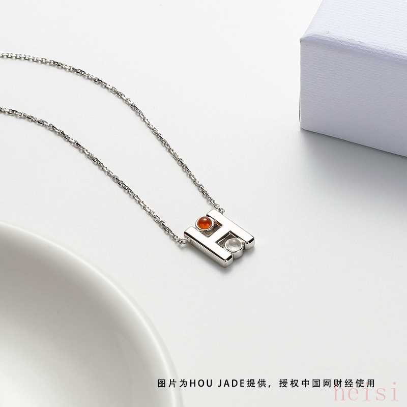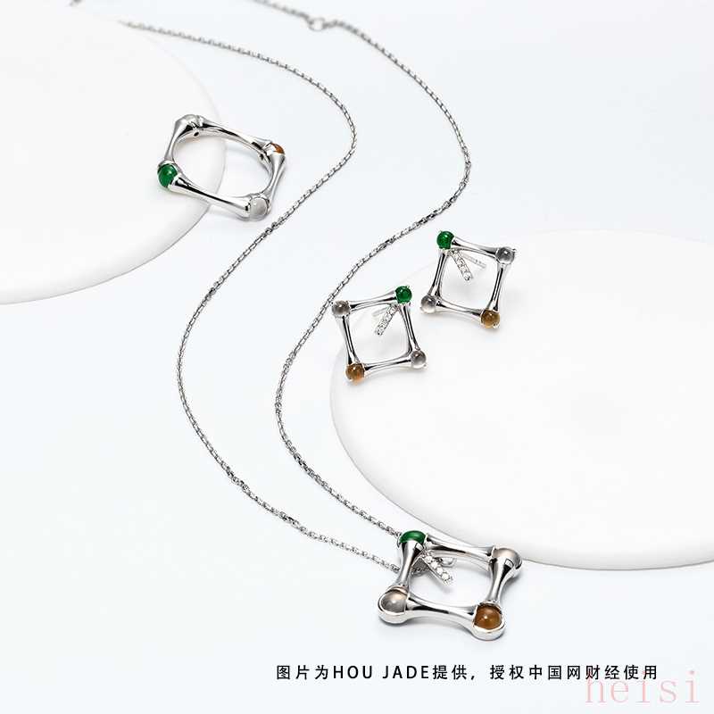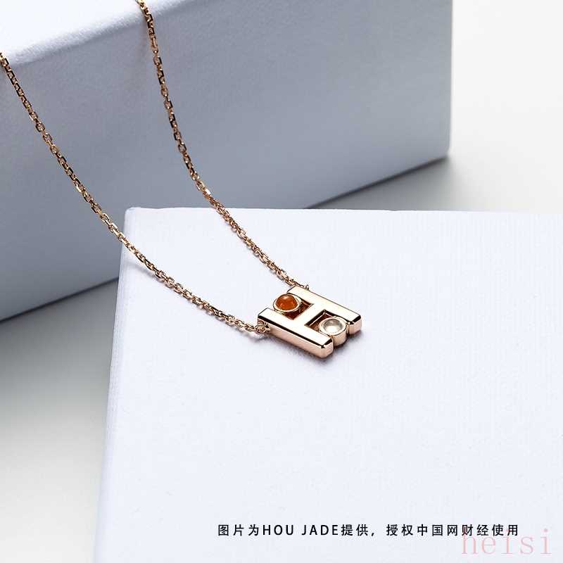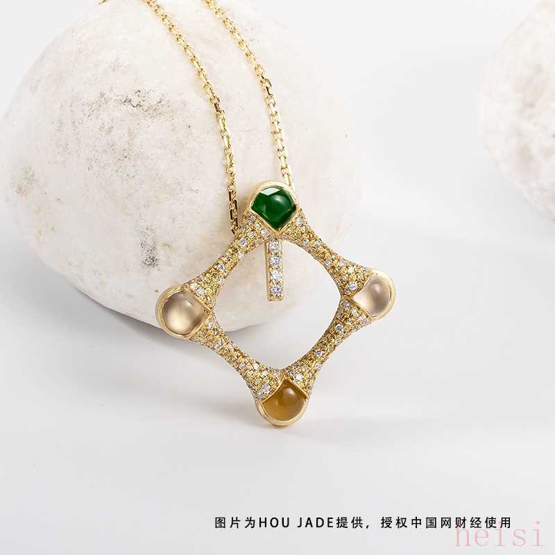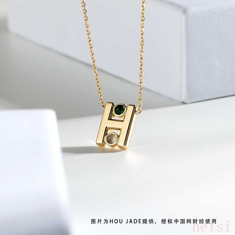 HOU JADE明星系列“H”款项链以特定品牌logo标志形象“H”与翡翠相融合。字母元素搭配多色翡翠,符合当下年轻时尚追求个性化的趋势,其呈现了几何线条光泽度与坚韧高贵的气质。