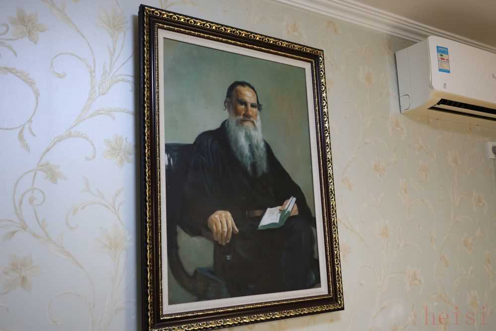 梁晓声书房的一面墙上有几幅充满俄罗斯风情的风景画,另一面墙上是一大幅托尔斯泰画像。画中的托尔斯泰身穿黑色长袍,正襟危坐,深邃的眼眸仿佛在与看画的人对视。