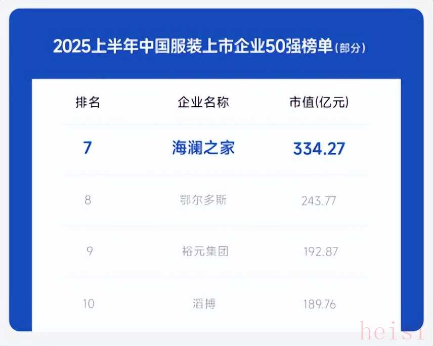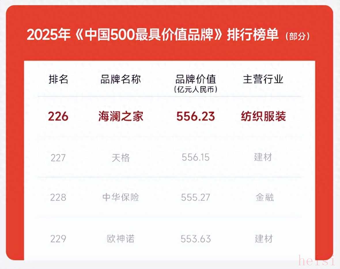 海澜之家据悉,在世界品牌实验室发布的“2025年中国500最具价值品牌”排行榜中,海澜之家以556.23亿元的品牌价值跻身第226位,稳居纺织服装行业前列。在中国服装网发布的“2025上半年中国服装上市企业50强”榜单中,海澜之家凭借强大的渠道布局优势与覆盖广泛的多元化品类规模位居第7位。