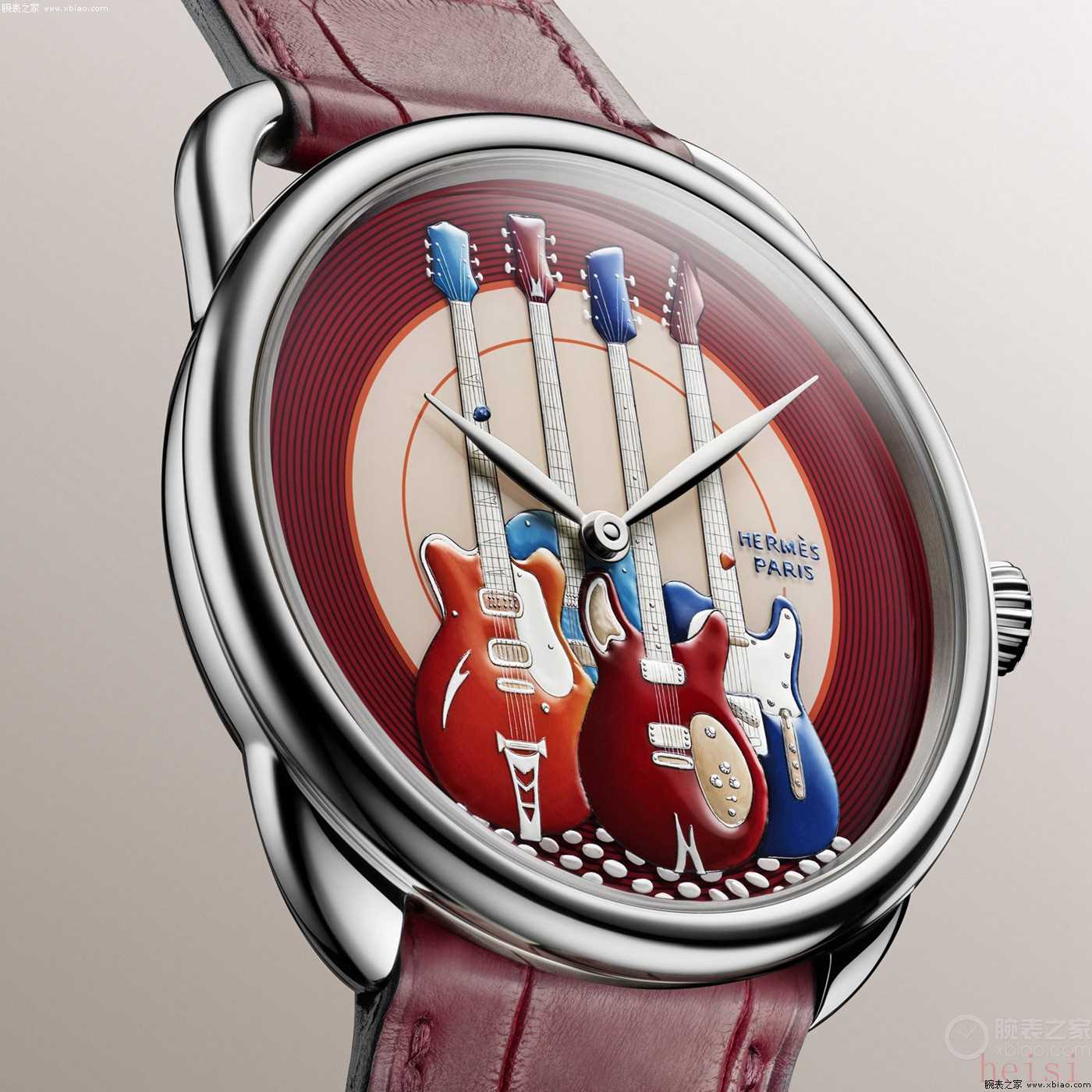 艺术家Carine Brancowitz曾为爱马仕On Air!丝巾设计吉他图案,此次她重新演绎个人作品,将其融入圆形表盘之中。四把色彩鲜艳的电吉他竖立,仿佛正在演奏。琴身和琴颈均手工精心绘制,细节之处尽显匠心。