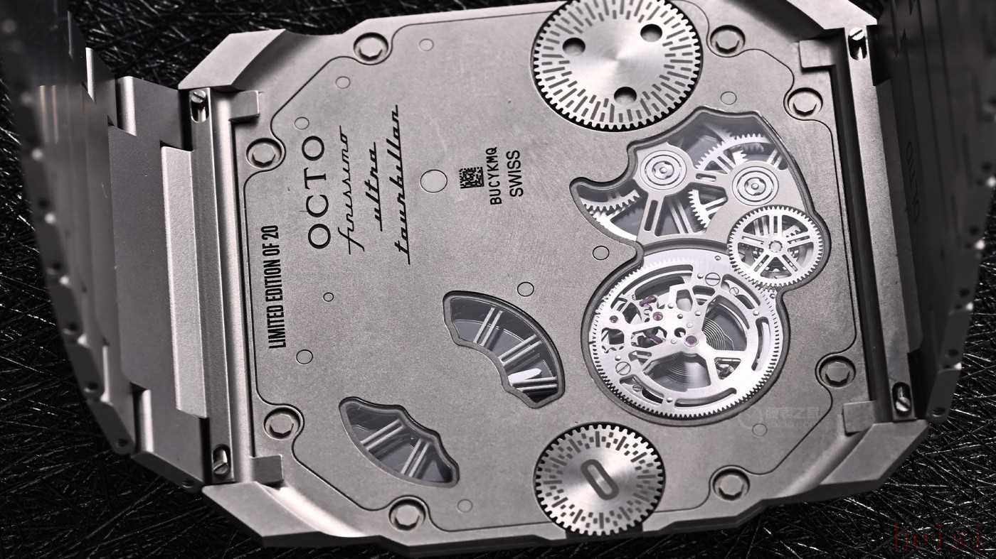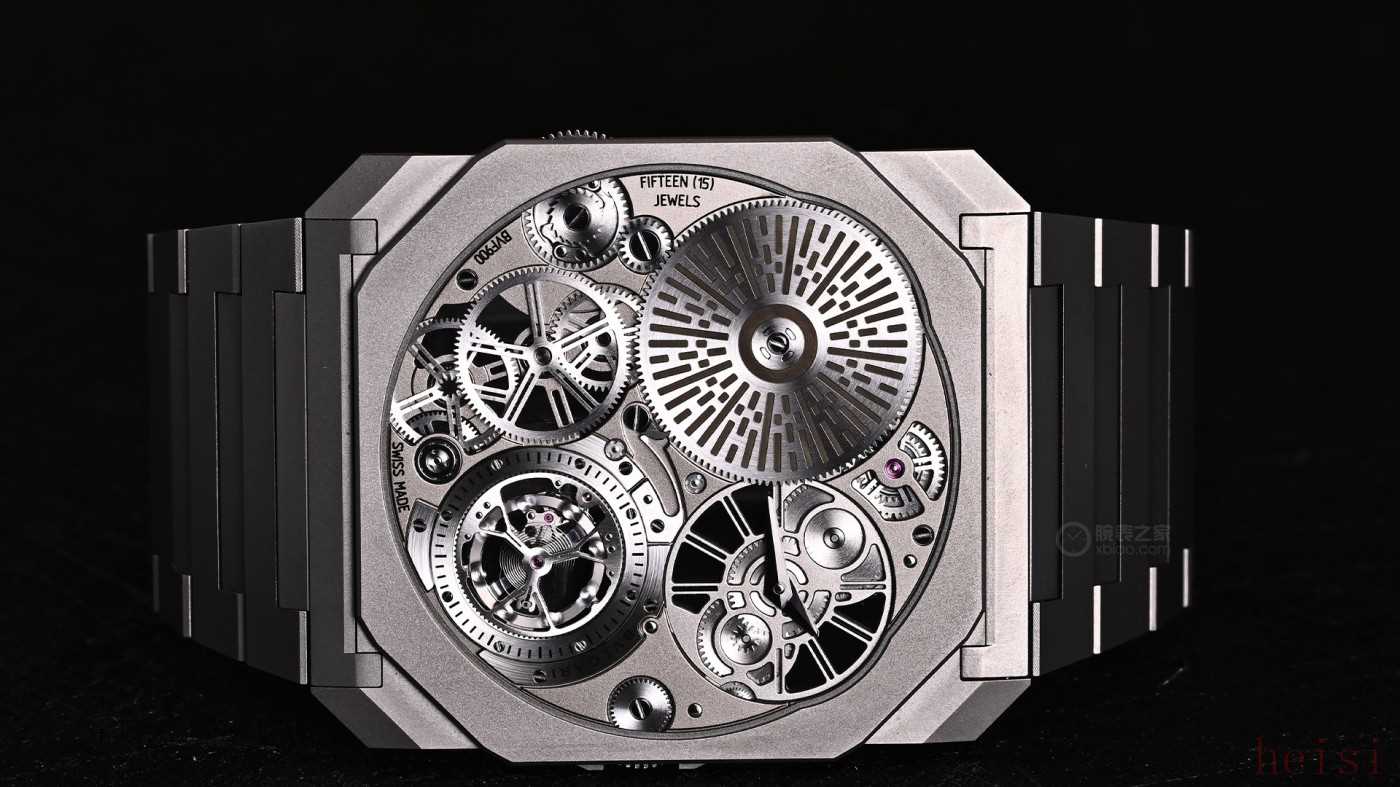 经典的八角形表壳是宝格丽Octo Finissim系列的标志,就算只有1.85毫米也依然具备有双层表壳。之所以能再度突破薄度,也是因为宝格丽把表壳底盖与机芯主夹板合二为一,机芯与表壳都成为了彼此的一部分。同时,机芯的轮系全部摊开于一个平面。