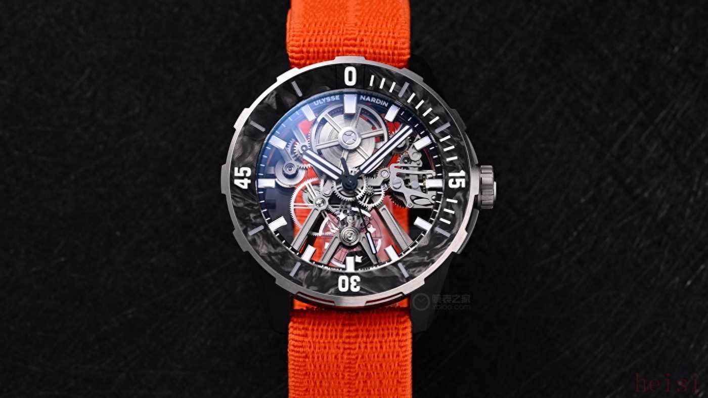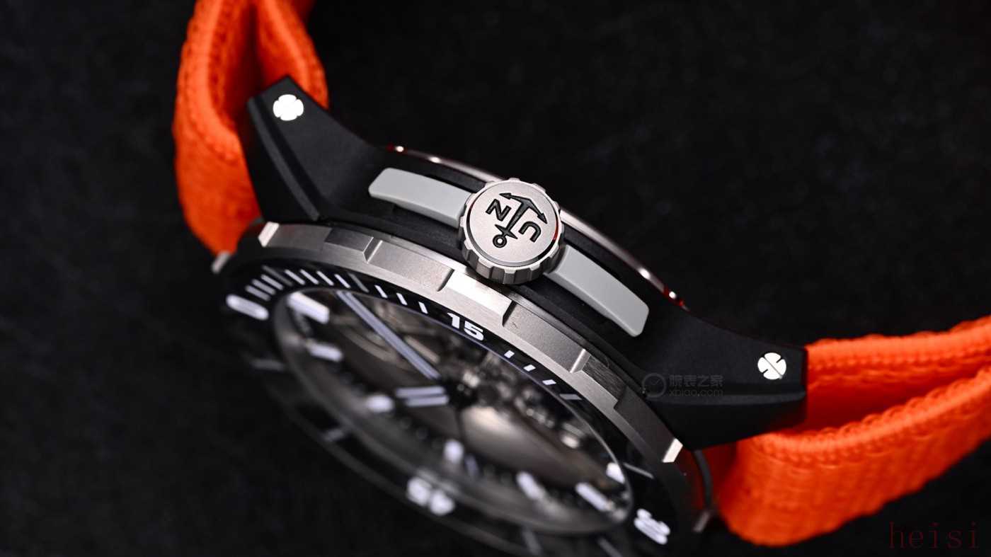 如此的轻量级少不了的一定是高科技材质的使用 再加上表盘的大面积镂空最大程度上减少不必要的重量。44毫米的表壳,表壳中层90%为回收再造钛金属材质,侧面使用Nylo®-Foil尼龙纤维,单向旋转表圈则采用CarbonFoil碳纤维材质。