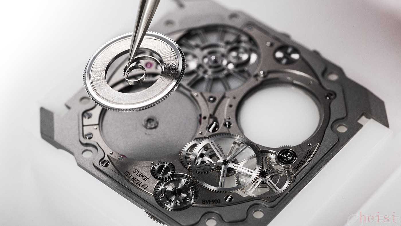 内部使用的是BVF 900陀飞轮机芯,采用手动上链系统,振频达28,800次/时(4赫兹),具备有42小时的动储能力。