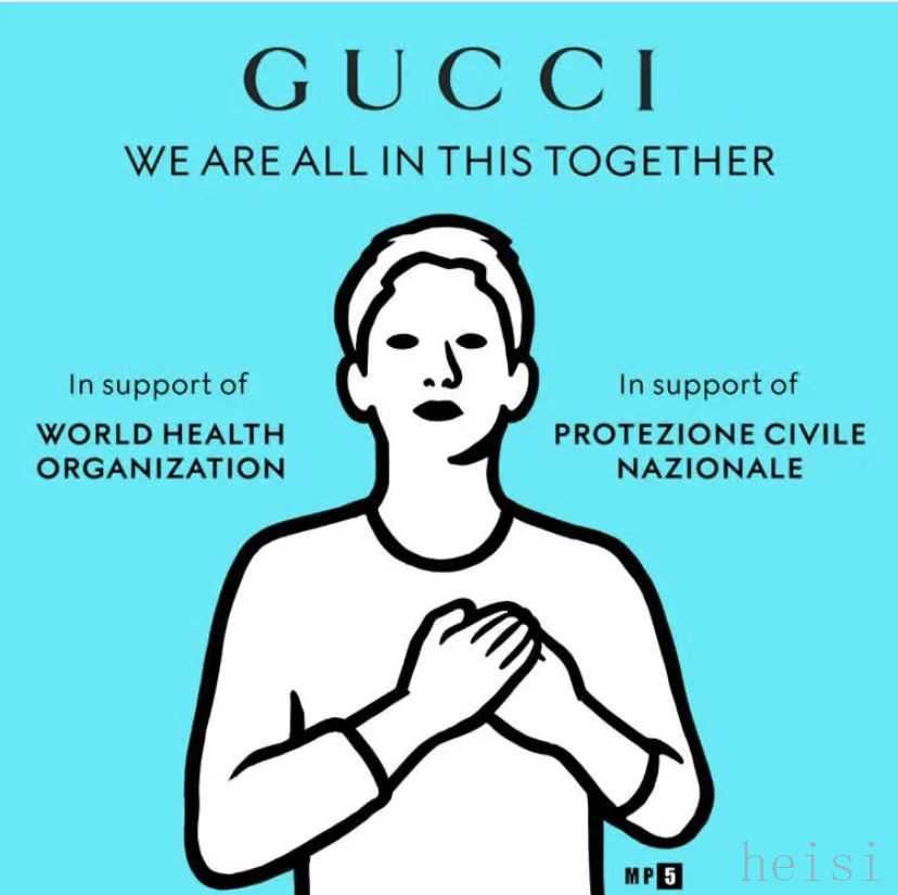 Gucci的母公司为多家医疗机构捐款抗疫,此前也曾为中国抗击肺炎疫情捐款750万人民币,Gucci还携手其全球社群参与两项众筹项目,正如海报中说:We are all in this together。