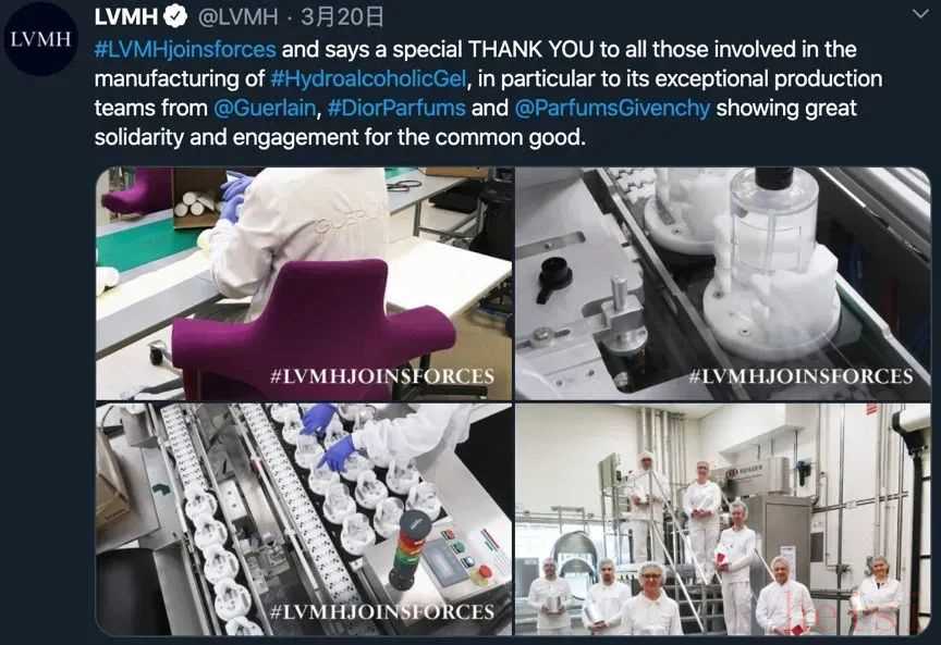 LVMH旗下品牌Dior、Givenchy、Guerlain香水生产线暂时改为生产洗手液并免费提供给医疗机构。随着疫情状况改变,有些地区工厂的生产线和产量也会随之改变。