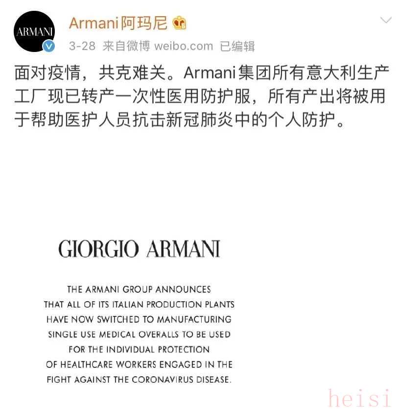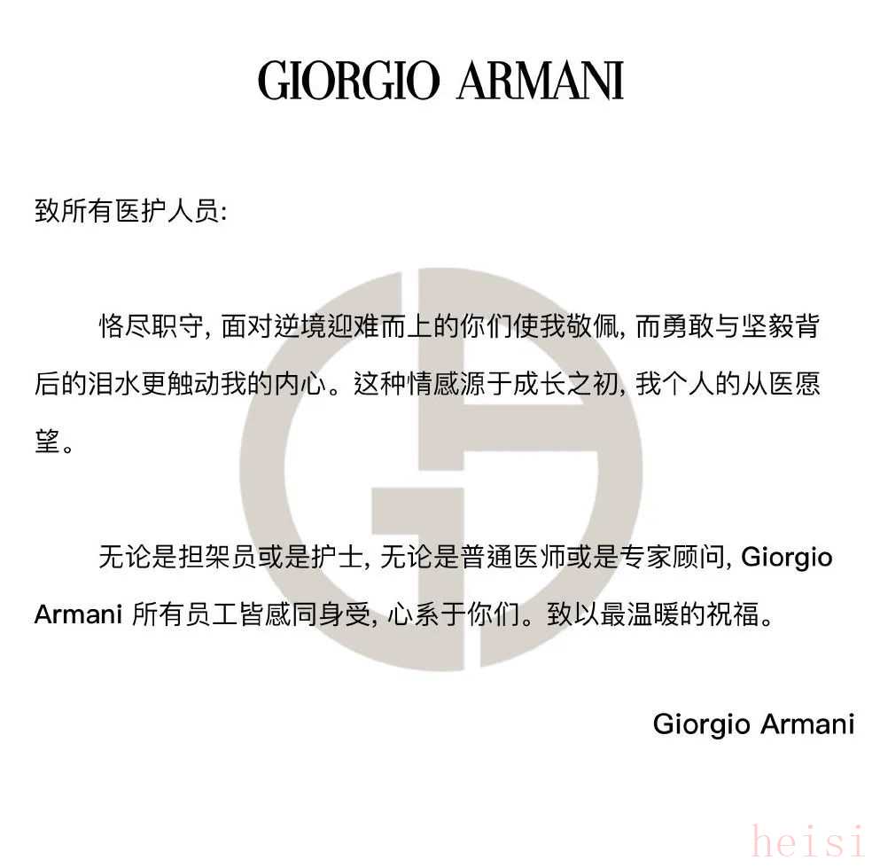 没错,著名时装品牌Giorgio Armani 作为意大利本土奢侈品大牌也在不遗余力支援此次战役。