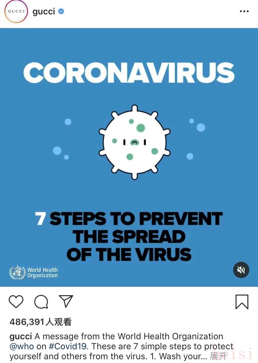 意大利品牌Gucci捐款200万欧元,而且将官方Instagram官方账号暂交给了世界卫生组织(WHO)管理,以助于向全世界的粉丝发布有关卫生信息,着实为公共卫生事业做出了不小的贡献。