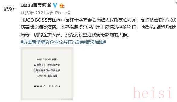 源于德国的奢侈品牌HUGO BOSS曾在一月向中国红十字基金会捐赠100万元人民币,用于新冠肺炎疫情。