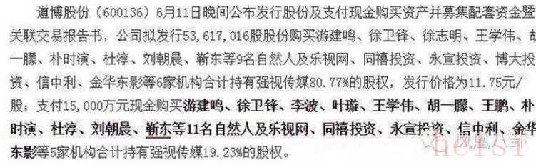 2013年3月,靳东以货币方式投入250万,获得东阳九天0.5%股权(强视传媒的前身系东阳九天影视传播有限公司)。然而,2014年6月,道博股份7.8亿收购强视传媒100%股份,跨入影视圈。靳东和叶璇、杜淳等明星,都是强视传媒的股东。这次交易中,叶璇、杜淳和靳东作为强视传媒股东,应获对价分别为2055万元、664.2万元和389.9万元。由此,1年零3个月的时间内,靳东的身价翻了近一倍!