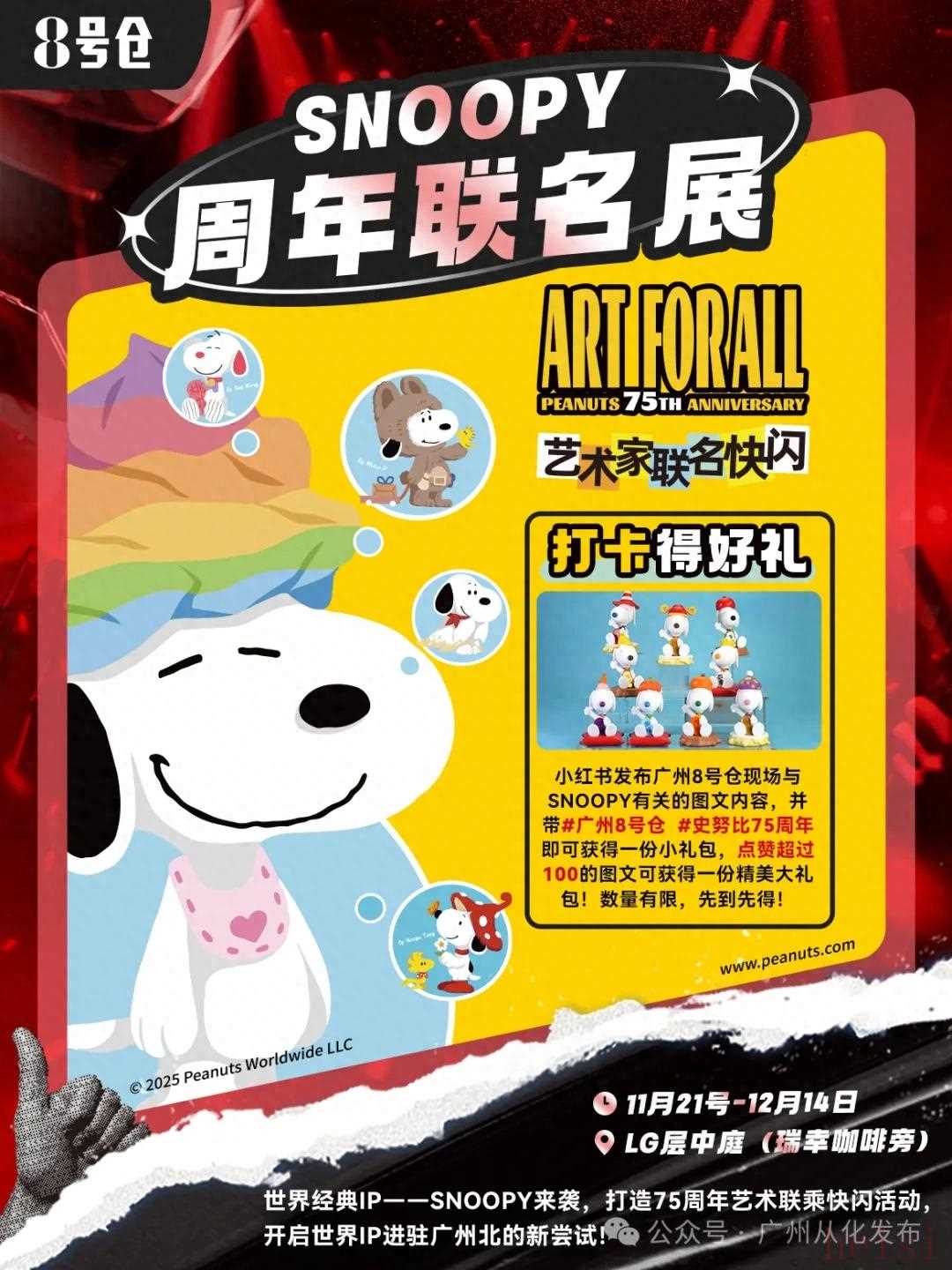 在现场和SNOOPY合影,随手记录南大门的美好瞬间,发布小红书带#广州8号仓 #史努比75周年 话题,就能领取专属小礼包;点赞超100更有精美大礼包等你来拿,数量有限,先到先得哦!
