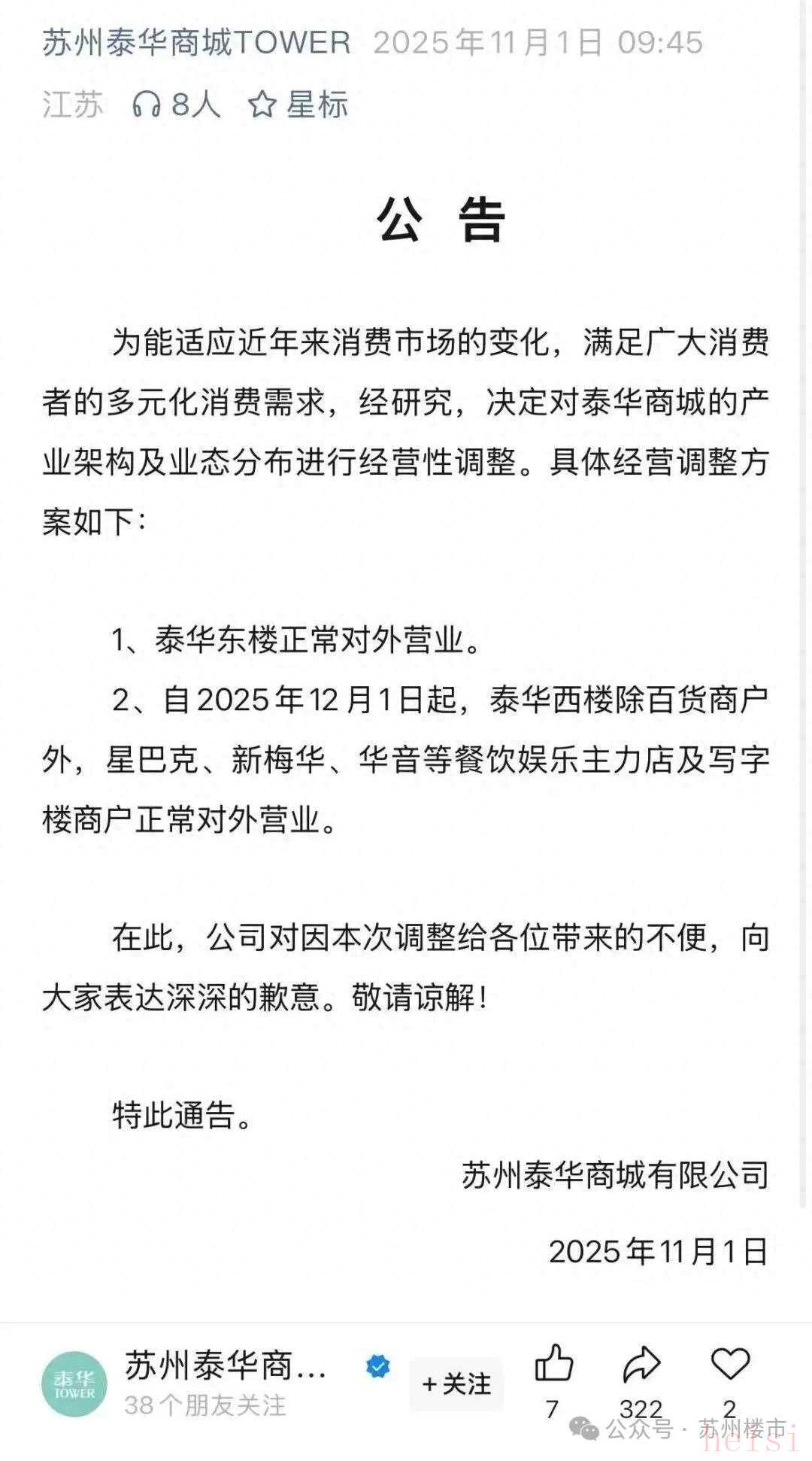此后调整公告发布内容,该公告中提到,为适应多元化消费需求,将对产业架构及业态分布进行经营性调整,这段时间里,泰华东楼仍正常对外营业;自2025年12月1日起,泰华西楼除百货商户外,星巴克、新梅华、华音等餐饮娱乐主力店及写字楼商户正常对外营业。
