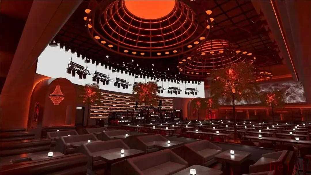 Live House效果图在1000平方米超大型无柱空间内,采用音乐人+表演SHOW+国际舞台形式,将国潮音、国际乐,hiphop文化绝妙地融合在一起,打造出多维潮玩调性主题派对空间。