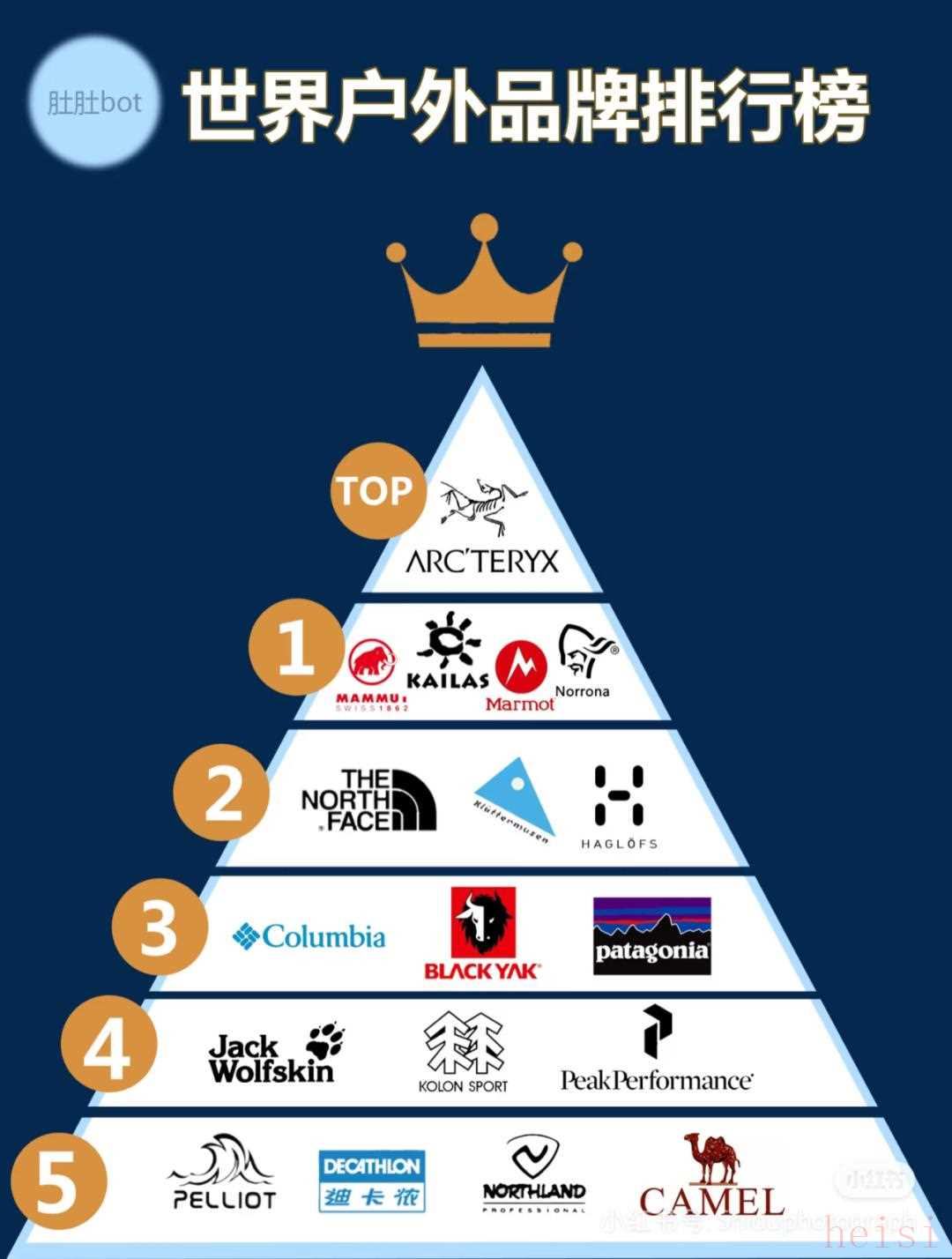 在户外运动的圈子里,流传着一张冲锋衣金字塔式的鄙视链图。