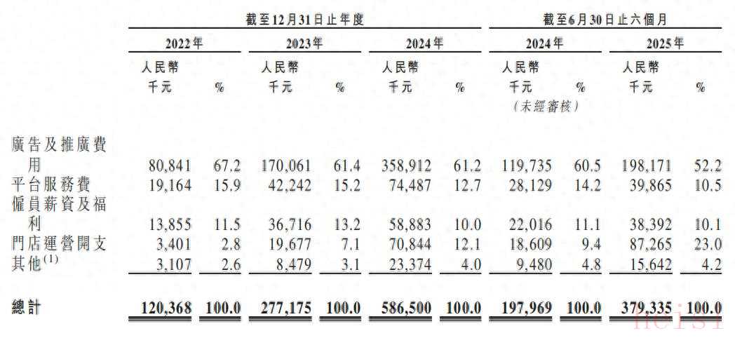 报告期内,伯希和销售及分销开支分别为1.2亿元、2.77亿元、5.87亿元、3.79亿元,分别占总收入的31.8%、30.5%、33.2%及41.5%,今年上半年费用占比再上一台阶。