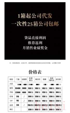 根据上述代理商提供的材料,VIMI薇迷“价格表”七层级别制度为:单价即零售,没有门槛及加盟费;会员级别,门槛为3盒没有加盟费;VIP级别,门槛为1箱(10盒/箱)没有加盟费;区级代理,门槛为2箱没有加盟费;市级代理,门槛为22080元,加盟费为1000元;省级代理,门槛为95400元,加盟费为3000元。虽然该代理提供的价格表中“大区”级别不能看到,但他表示:“大区原来40多万元,现在活动28.8万元。”