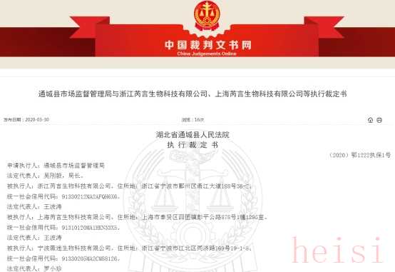 中国网财经3月31日讯(记者 常实 段思琦)昨日,中国裁判文书网公布一则《通城县市场监督管理局与浙江芮言生物科技有限公司、上海芮言生物科技有限公司等执行裁定书》,该裁定书由湖北省通城县人民法院发布。
