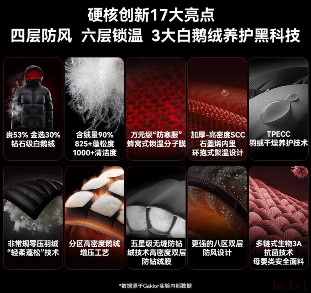 为从根源解决锁温难题,GaKior 坚持选用贵一倍的钻石级白鹅绒,并构建四层防风、五层锁温及3大白鹅绒养护系统,集成10余项黑科技。包括加厚高密度SCC石墨烯内里、环抱式聚温技术、万元“极寒服”同款蜂窝式锁温分子膜、TPECC羽绒干燥养护、分区高密度鹅绒增压、EPX防风生物涂层、PBE三级抗湿、微弹力耐磨及AOSS降风阻等技术,从根源解决羽绒锁温难题。