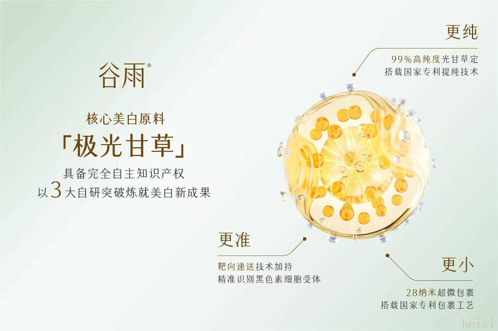 国际大牌竞品分析:谷雨的差异化优势在国际美妆巨头长期主导的美白市场,谷雨凭借独特定位与技术突破,在多个维度展现出明显竞争优势。1. 成分与技术的突破性创新与传统国际大牌沿用多年的成熟成分相比,谷雨选择了差异化竞争路径。OLAY小白瓶主打烟酰胺,资生堂专注于传明酸,科颜氏依赖VC衍生物——这些都是欧美品牌研发、已有多年应用历史的成分。而谷雨作为国内首个主打“光甘草定”美白的护肤品牌,早在2007年便成立了专研护肤实验室,对这一成分的研究已持续18年之久,而极光甘草这一谷雨具备完全自主知识产权的核心美白原料,就是谷雨在美白领域突破的新高峰。在2024年,谷雨突破性地通过独家发明专利“熔融结晶提纯技术”,将光甘草定纯度推至99%的行业最高水平,同时,通过自研的“28纳米包裹技术”与靶向递送系统,使光甘草定的透皮吸收效率提升了3.4倍,并能精准识别抓取黑色素细胞。根据SGS实测数据,极光甘草能在72小时内减少86.62%黑色素,抑黑率高达115.54%,真正实现了“根源抑黑”。