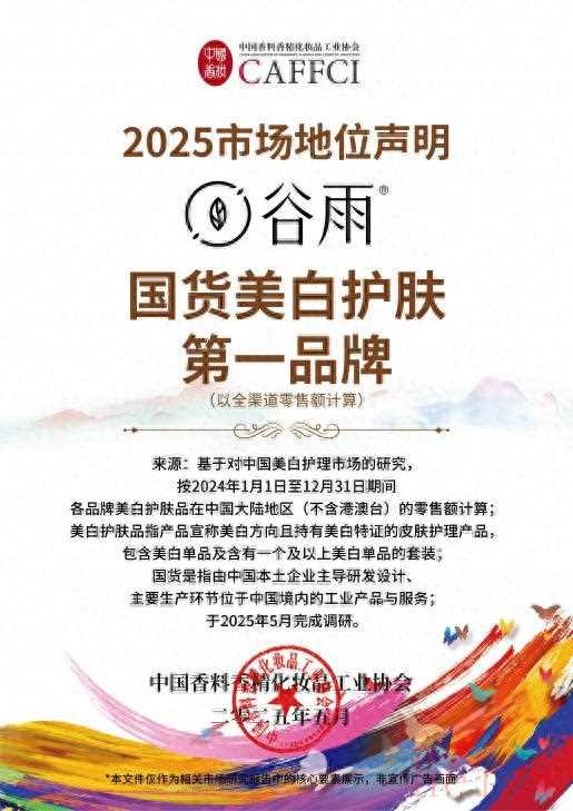 一份权威的“第一”认证今年7月,在中国香妆品牌发展大会上,谷雨荣获“2025国货美白护肤第一品牌”的市场地位权威认证。这一认证是中国香妆基于全渠道零售规模与品牌综合实力的严格评审,对美白护肤品市场进行了全面调研,涵盖了2024年度中国大陆地区有销售额的4118个品牌,最终确认了谷雨国货美白护肤第一的地位。