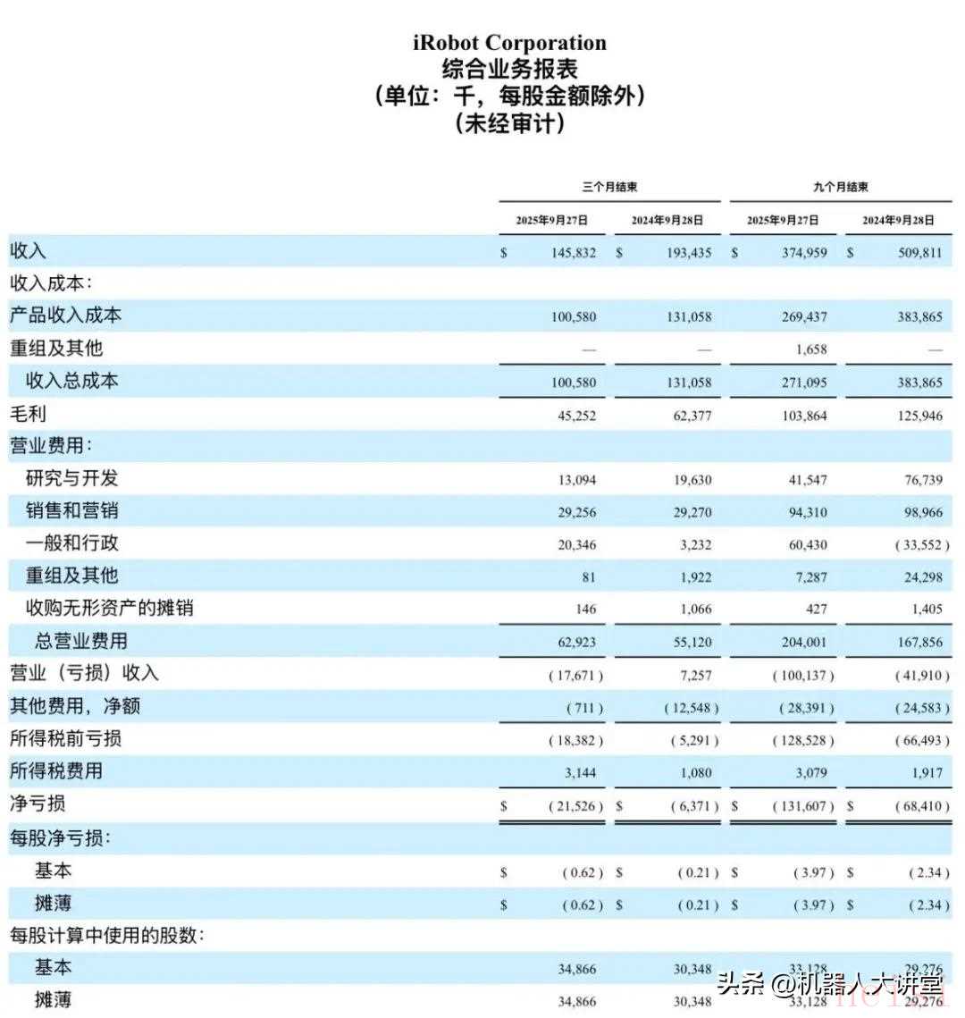 近日,iRobot公布截至2025年9月27日的第三季度财务业绩,数据令人触目惊心。这家曾经的市场霸主,如今正面临生存危机。