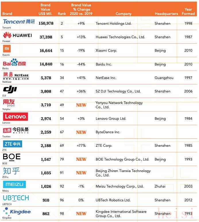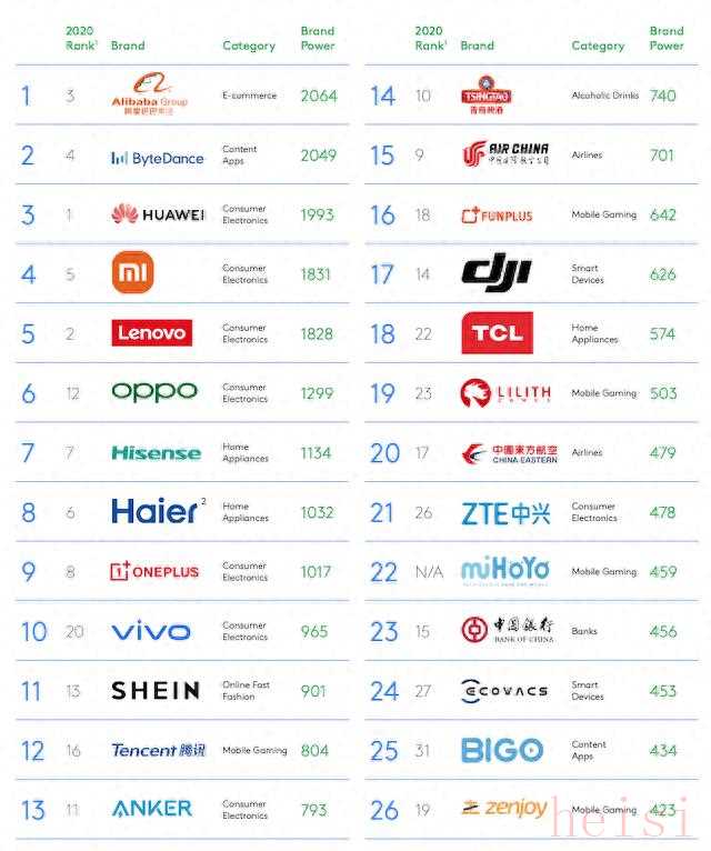 以下是入选的10个中国品牌及其大致的排名(具体排名可能因小数点差异略有不同):