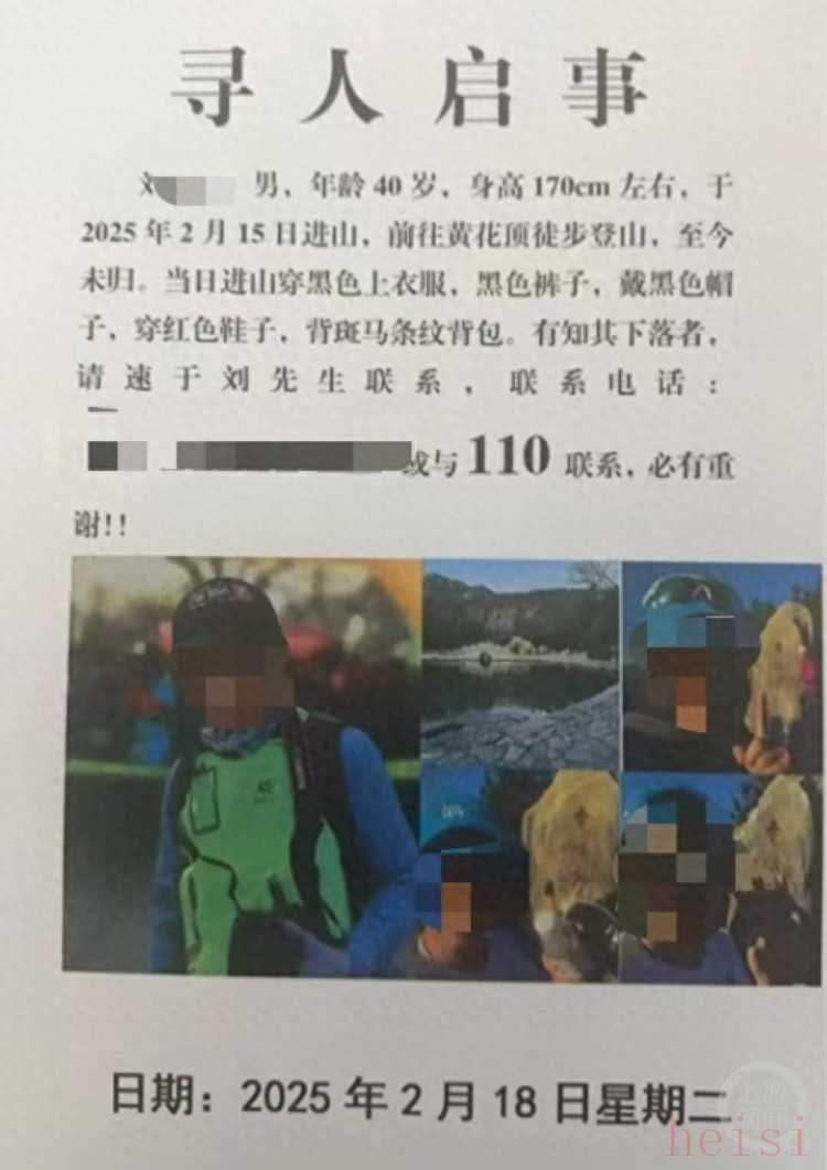 记者看到,亲属发布的寻人启事显示,失联者刘某某年龄40岁,身高170cm左右,于2025年2月15日进山,前往黄花顶徒步登山,至今未归。当日进山穿黑色上衣、黑色裤子,戴黑色帽子,穿红色鞋子,背斑马条纹背包。亲属表示:“有知其下落者,必有重谢。”22日晚,有救援队员称,人已经找到,疑似在登山时坠崖,搜救也于23日凌晨3点结束。