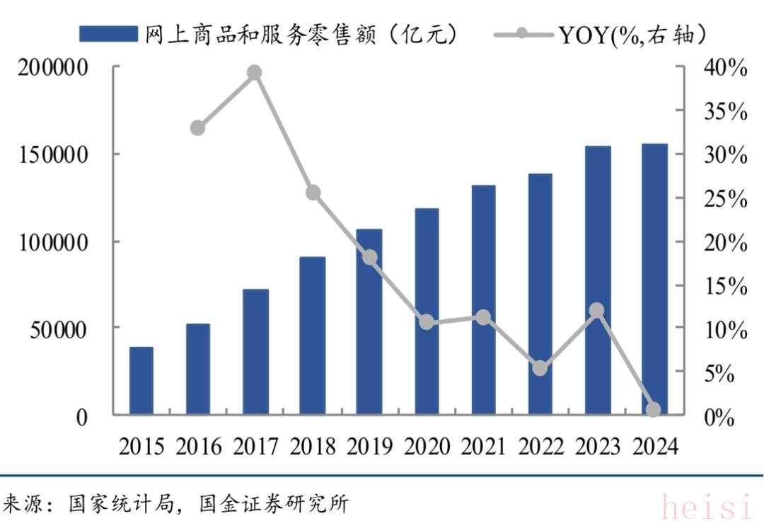 事实是:自十年前开始,各个品类的消费量就已经不同程度地转移到了线上。线上商品和服务零售额占社会总零售额比例不断提升,到2024年底大概是30%多,增速有所下降,但确实还在增长(图2)。