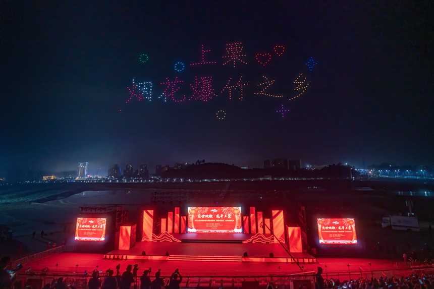 无人机表演组成“上栗 烟花爆竹之乡”的文字图案。姚茜摄