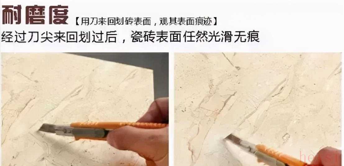 瓷砖不管是用在墙面上还是地面上,都要考虑到耐磨系数,特别是对于地面的瓷砖来说,更为重要。在挑选瓷砖时,耐磨系数挑选时不能低于3-4度,这样才能让瓷砖经久耐用。测试最直接的方法就是用尖锐物在瓷砖表面上来回划,如何表面无任何划痕,就说明是好瓷砖,反之就说明是差瓷砖。