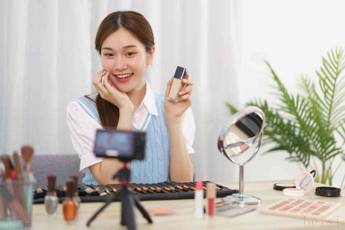 美容博主概念,年轻的亚洲女性在直播中向订阅者推荐遮瑕膏。