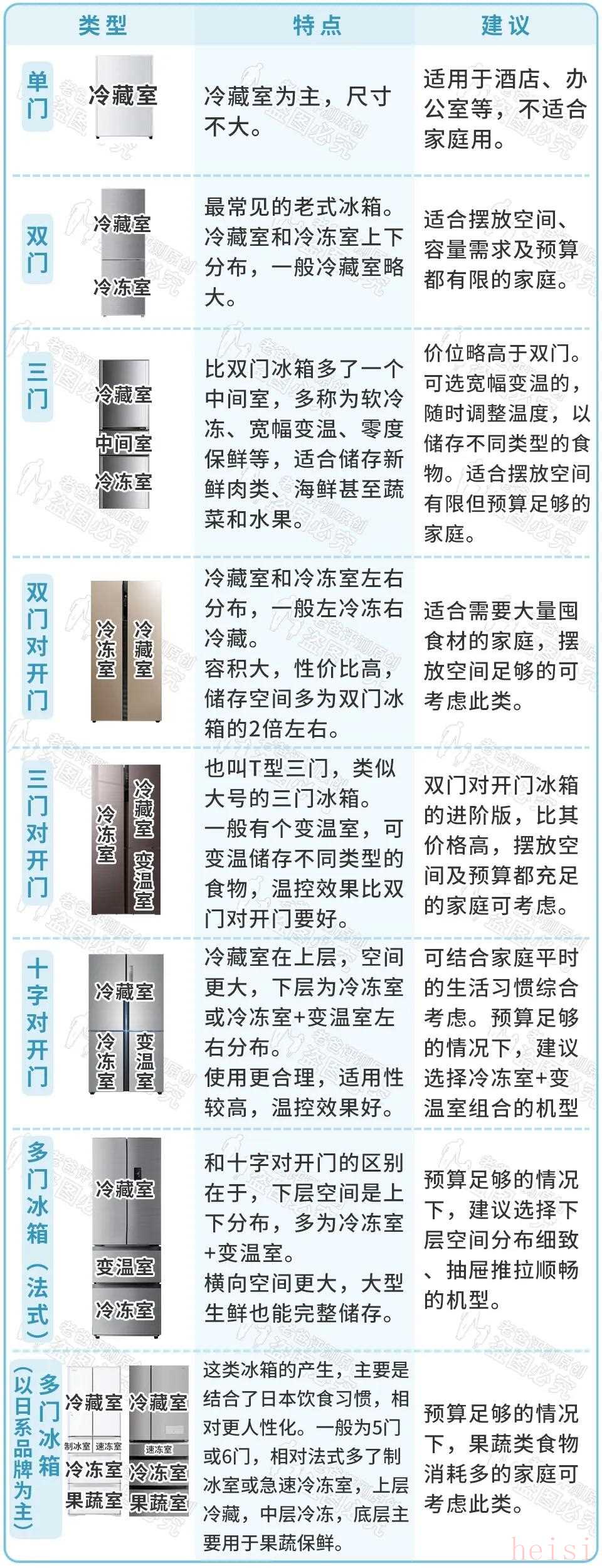按照冰箱门分类,可分为单门、双门、三门、双门对开门、三门对开门、十字对开门和多门冰箱。一张图示,请收好。