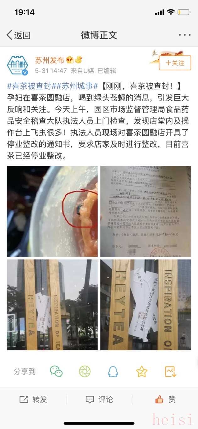 5月31日,苏州市人民政府新闻办公室官方微博“苏州发布”推送微博称,一孕妇在喜茶苏州圆融广场分店喝到绿头苍蝇。对此,31日上午,苏州工业园区市场监督管理局食品药品安全稽查大队执法人员上门检查时,发现“店堂内及操作台上飞虫很多”。