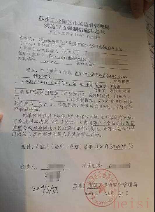 苏州工业园区市场监督管理局对喜茶相关门店开出行政强制措施决定书
