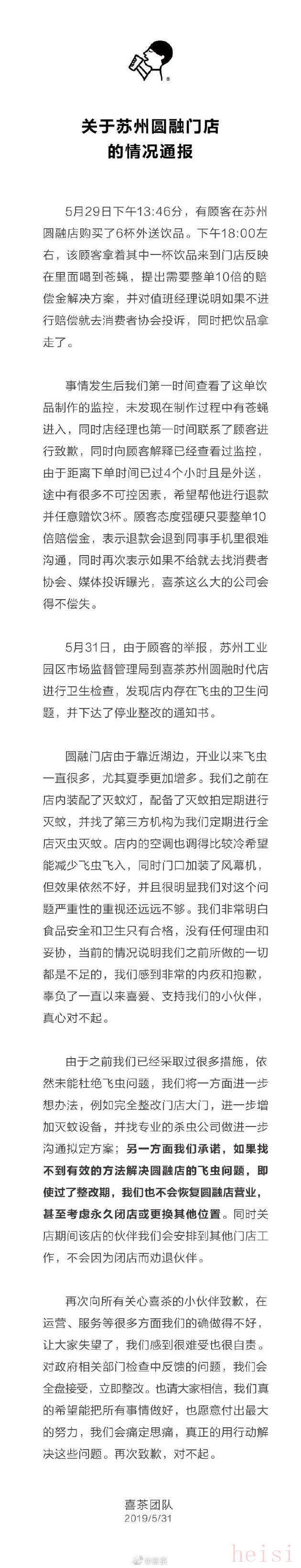 对此,喜茶表示,将采取进一步措施,解决飞虫问题,倘若无法解决该问题,即便经过整改期,亦不会恢复该门店,甚至考虑永久关闭门店,或更换其他位置。