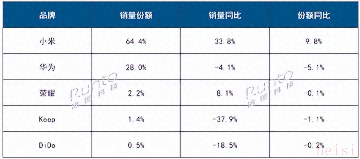 洛图科技公开的TOP5品牌中,小米、华为位居冠亚军宝座,而荣耀、Keep和DiDo则位列后三名。尽管荣耀排名第三,但销售份额仅2.2%,与第二名的华为差距较大。