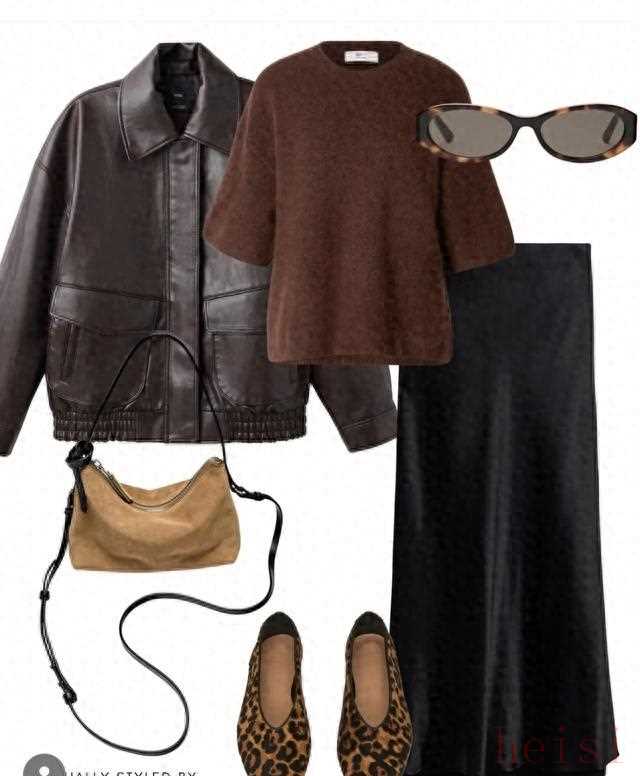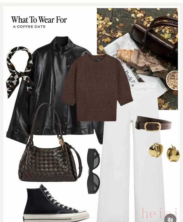 "皮衣选择:" 中长款、略带复古水洗或做旧痕迹的黑色皮夹克。