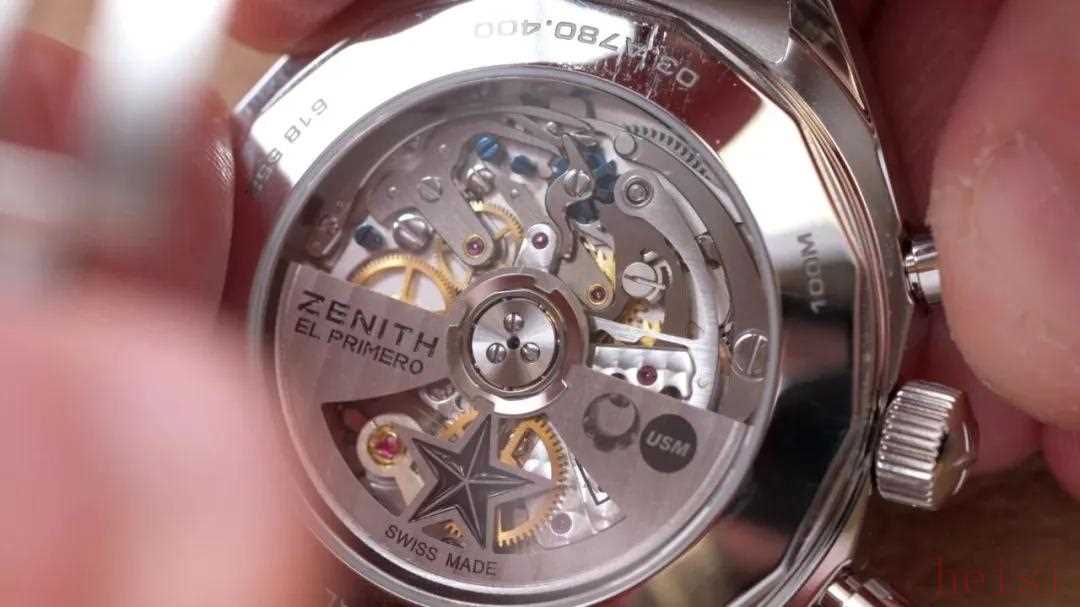 机芯采用的是真力时高振频的传统机芯EL Primero 400,背透设计,并且自动陀上也印上了USM的logo,虽然没有用上真力时当下最厉害的计时机芯,但也算搭配了复古壳型,我理解为是一种“统一”,而且如果你是复古派的爱好者,这枚机芯是市面上目前还能买到的全新的真力时家族第一批自动计时机芯,这一点让这枚手表的收藏价值变得更高。