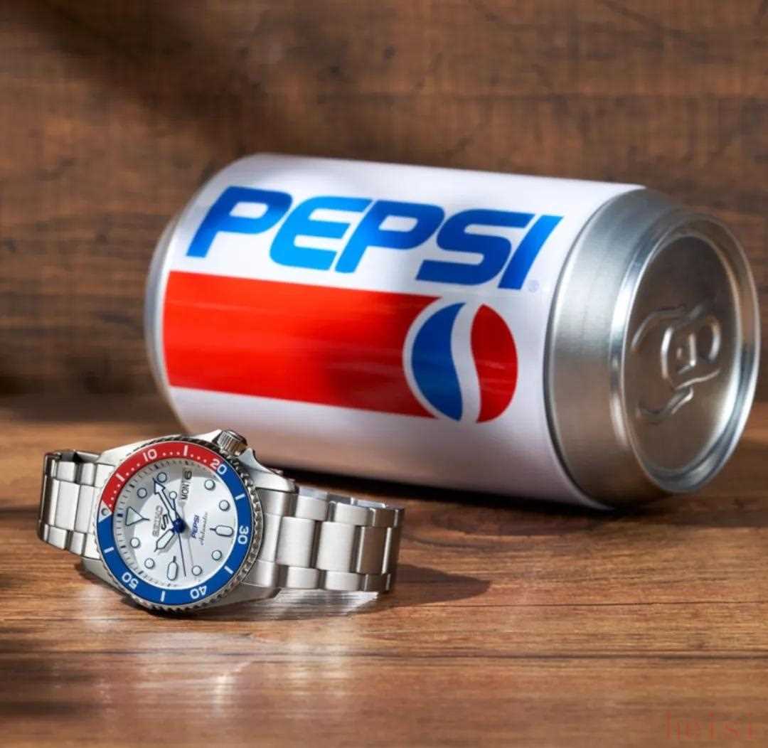 精工5 Sports x Pepsi限量版腕表 售价:380欧元,约合人民币3,200元(白色)540欧元,约合人民币4,500元(黑色)通常我们把蓝、红配色的GMT腕表统称为“百事圈”,来源于百事可乐的标志性配色,从劳力士格林尼治型开始,“百事圈”、“可乐圈”、“雪碧圈”层出不穷,虽然得不到官方的认证,但是这一昵称早已成为一个”标志”。今年精工和百事可乐联名,以精工的5 Sports系列经典设计叠加百事可乐的“logo元素”,推出全新全新5 Sports x Pepsi限量版腕表——一枚真正意义上的百事可乐表。