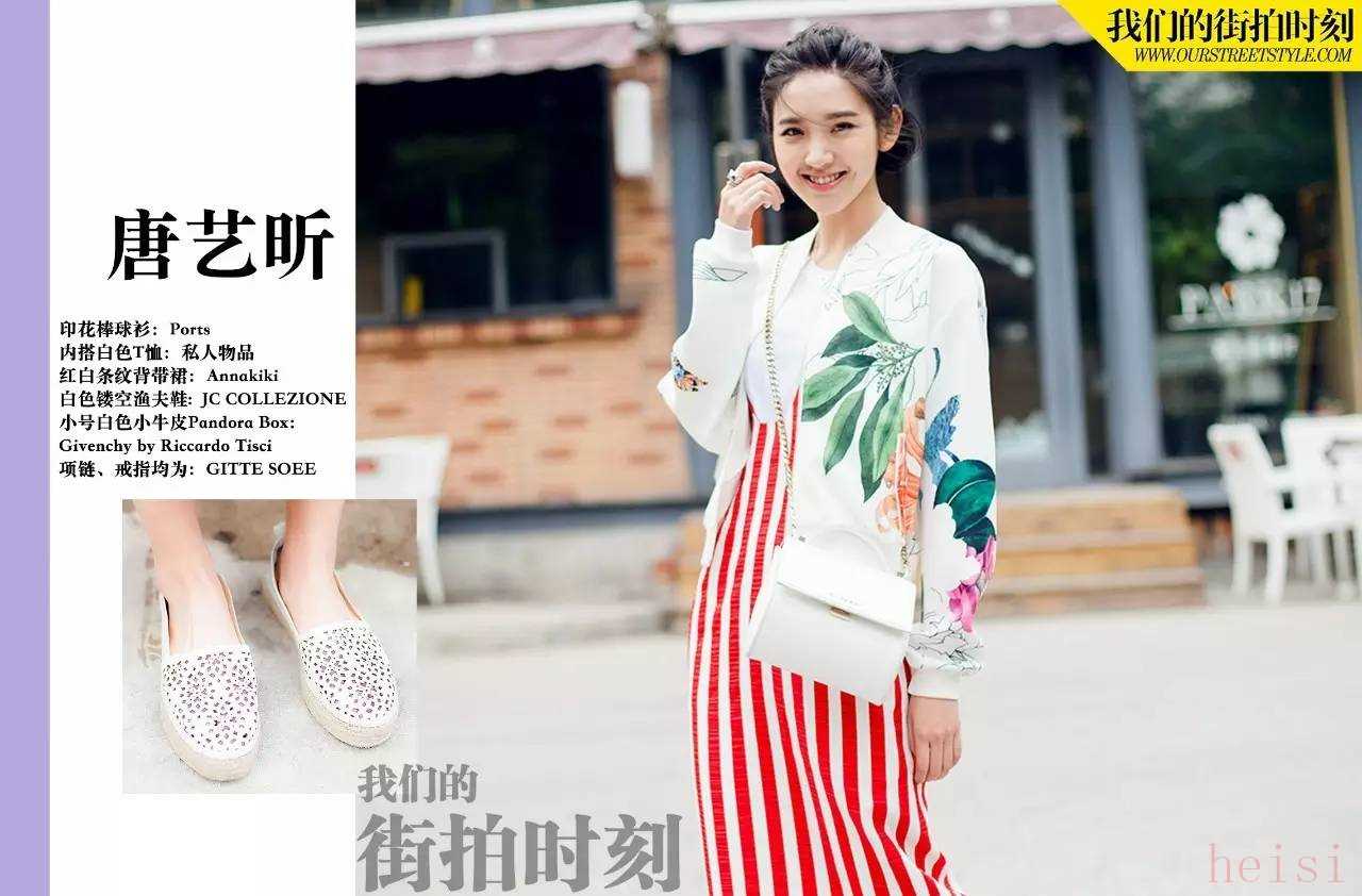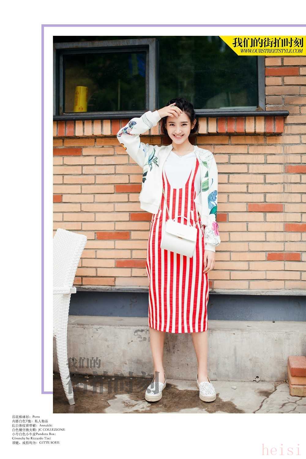 Tips:白色印花棒球衫搭配经典白T和红白条纹背带裙,充满着年轻有活力的少女味,一双白色镂空渔夫鞋的加入让时髦感更是瞬间up!