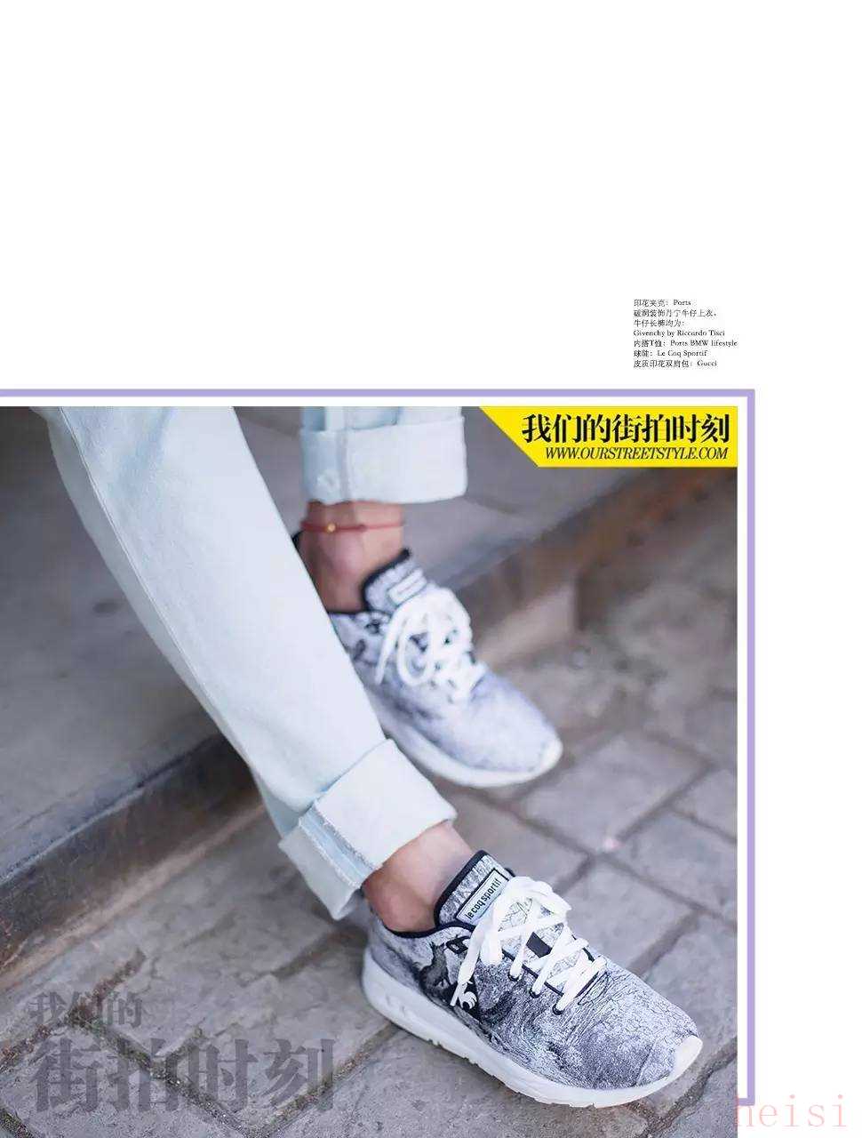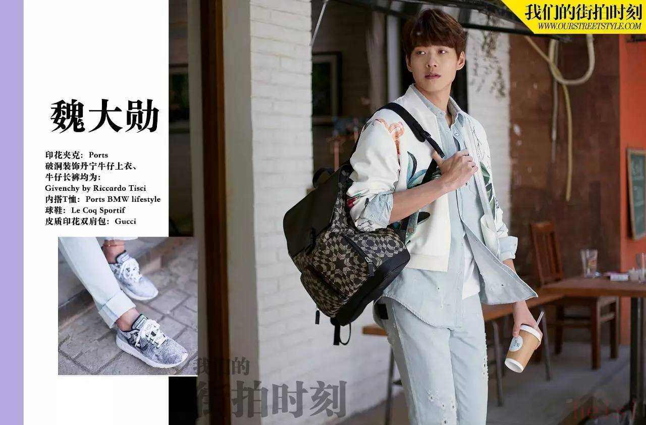 Tips:整身的浅色牛仔搭配简洁干练印花夹克,膝间玩味的破洞好似花朵一般的点缀。踩着一双颇带纹理的运动鞋,再挎上一个皮质罗盘花纹双肩背,轻盈自如间不失优雅的风度。