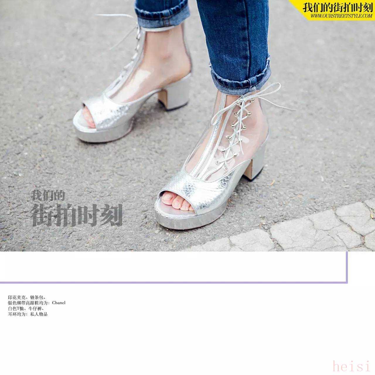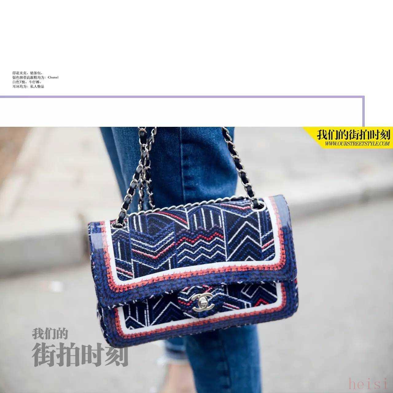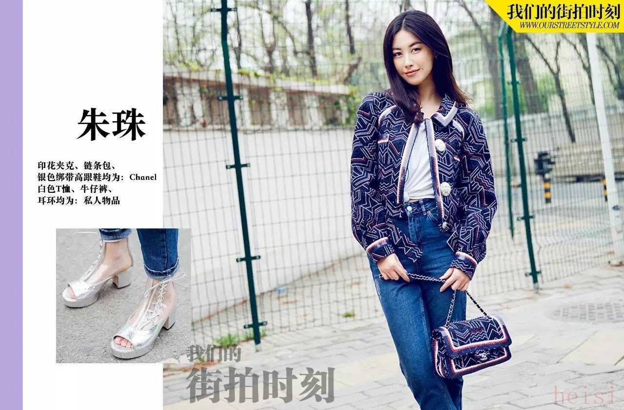 印花夹克、链条包、银色绑带高跟鞋均为:Chanel